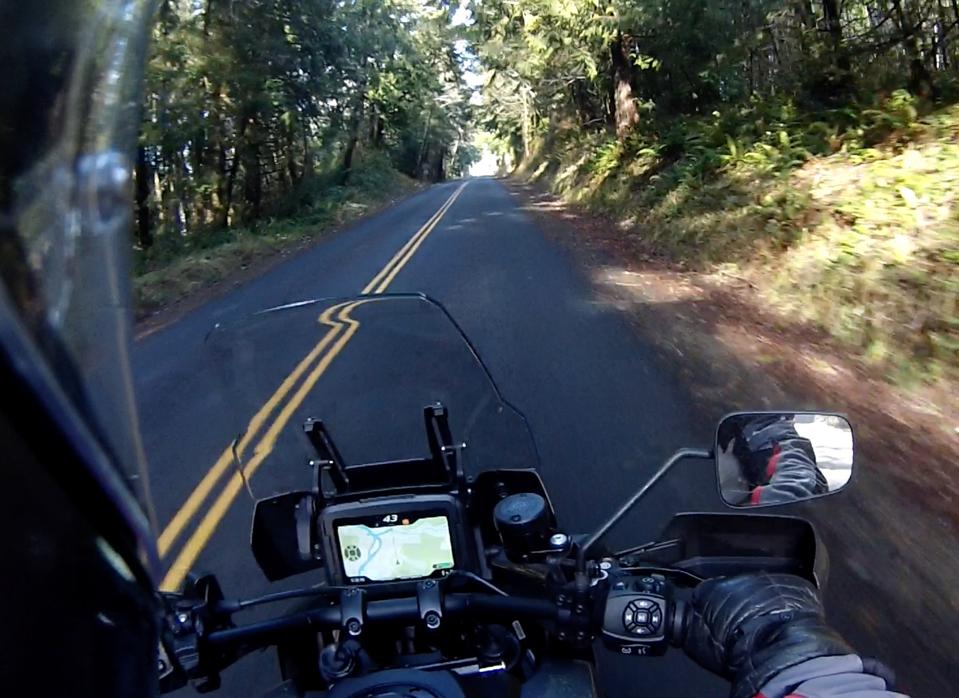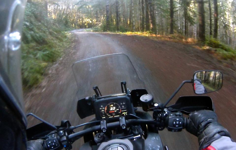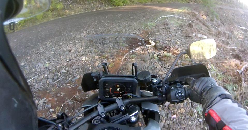 The muddy gravel logging road threads for miles through deep woods and along clearcuts, and through some small pockets of fog that are quickly dissipating as the sun climbs a bit higher into the sky. The temperature drops into the high 30s but then stabilizes, although I do see a few frozen puddles along the way in shaded areas. Now, the Pan America is in its other element, and I push the speed up a bit as it blasts through ruts full of pine needles and numerous muddy passages. Exiting tight corners, I get brave and goose the throttle, throwing some muddy roost from the back tire before traction control intervenes on my behalf as the back end of the Pan Am begins to rotate around a touch too much. Set to Off-Road Soft, the supple suspension eats up washboard sections and chop, and as the road climbs toward Klaskanie Summit, the way forward goes from gravel to rutted, rocky two-track in places, and I pick through the rough stuff in first and second gear, standing on the pegs, grinning in my helmet, visions of crossing Siberia and the Peruvian Andes slotting onto my mental bucket list.