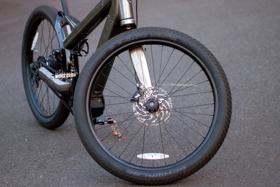 A 500-Watt Shimano E6100 mid-drive motor with 60Nm of torque supplies power and draws juice from a 630Watt-hour battery that’s inside the frame, but it’s also replaceable and recharges in three hours. Ellsworth claims the battery gives the bike about 100 miles of pedal-assisted range. Full internal cabling cleans up the look and even the bright LED headlight and tail light are integrated into the frame. The Radiant Carbon is sleek, sci-fi cool, and very cleanly designed. It looks like it came from a cleaner, smarter future. There’s not even a vestigial kickstand to mar the clean lines, it’s been cleverly integrated into the left side pedal.