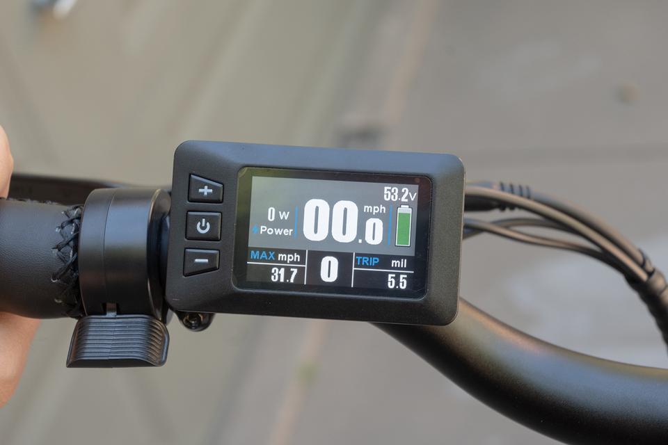 Beside the throttle on the left side you’ll find a nifty color display that tells you everything you need to know, including the power remaining, speed and distance traveled. It was easy to read in any lighting conditions, even mid-day with a bright sun overhead. The up/down pedal assist controls are built into the display as well.