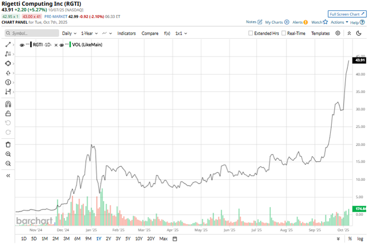 RGTI stock has been on a tear over the past year as the company has unveiled some significant developments amid the rapid growth of the quantum computing field. Over the past 52 weeks, the stock has gained a whopping 4,600%, while it is up 193% year-to-date (YTD). RGTI stock reached a fresh 52-week high of $58.15 on Oct. 14, although it is now down 23% from that high.