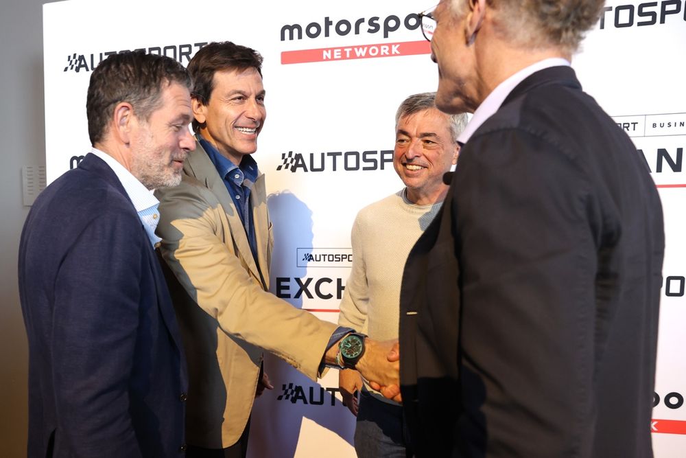 From left, Gary Fegel, Toto Wolff, Eddy Cue, and Werner Brell talk during Autosport Business Exchange New York (Photo by: Getty Images)