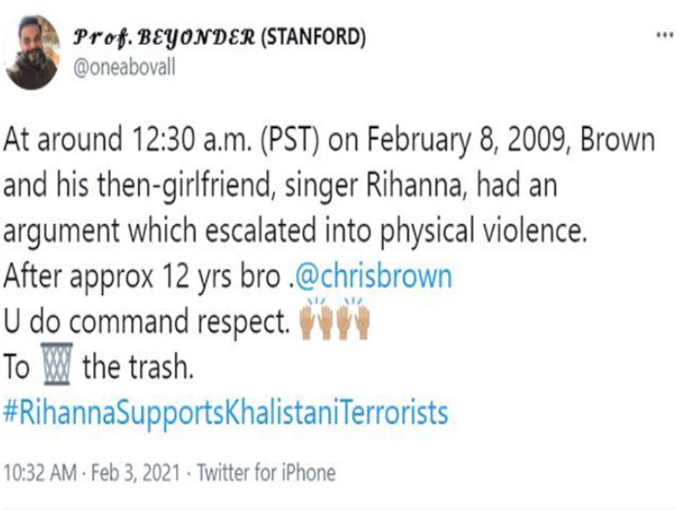 While the foreign ministry took a more measured tone, the statement was also accompanied online by vicious trolling from supporters of the Modi government directed at Rihanna. It included racist and misogynistic slurs, and some posts that expressed support for the singer Chris Brown, who was convicted for beating Rihanna when they were in a relationship.