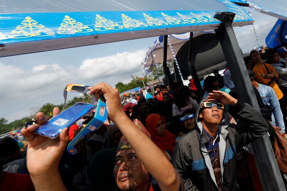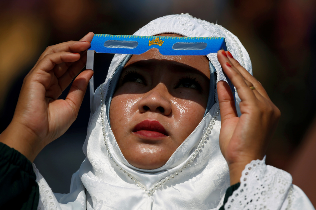 A man observes a partial solar eclipse in Jakarta, Indonesia December 26 2019. REUTERS/Ajeng Dinar UlfianaA muslim woman wearing hijab observes the annular solar eclipse before taking part in a mass prayer in Siak, Riau province, Indonesia, December 26, 2019. REUTERS/Willy KurniawanA partial annular solar eclipse is observed with the use of a solar filter in Siak, Riau province, Indonesia, December 26, 2019. REUTERS/Willy KurniawanPeople observe the annular solar eclipse in Siak, Riau province, Indonesia, December 26, 2019. REUTERS/Willy KurniawanA girl wearing special protective glasses reacts as she observes the annular solar eclipse in Siak, Riau province, Indonesia, December 26, 2019. REUTERS/Willy KurniawanA man looks at the sun as he tests his special protective glasses before the annular solar eclipse in Siak, Riau province, Indonesia, December 26, 2019. REUTERS/Willy KurniawanA vendor raises protective glasses for the solar eclipse in Siak, Riau province, Indonesia, December 26, 2019. REUTERS/Willy Kurniawan
