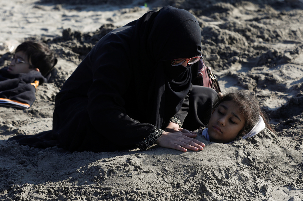 A woman comforts her daughter, buried up to her neck in sand during a solar eclipse, along Clifton beach in Karachi, Pakistan December 26, 2019. Many Pakistanis believe that burying people with disabilities in sand during solar eclipse would bring healing to their bodies. REUTERS/Akhtar Soomro