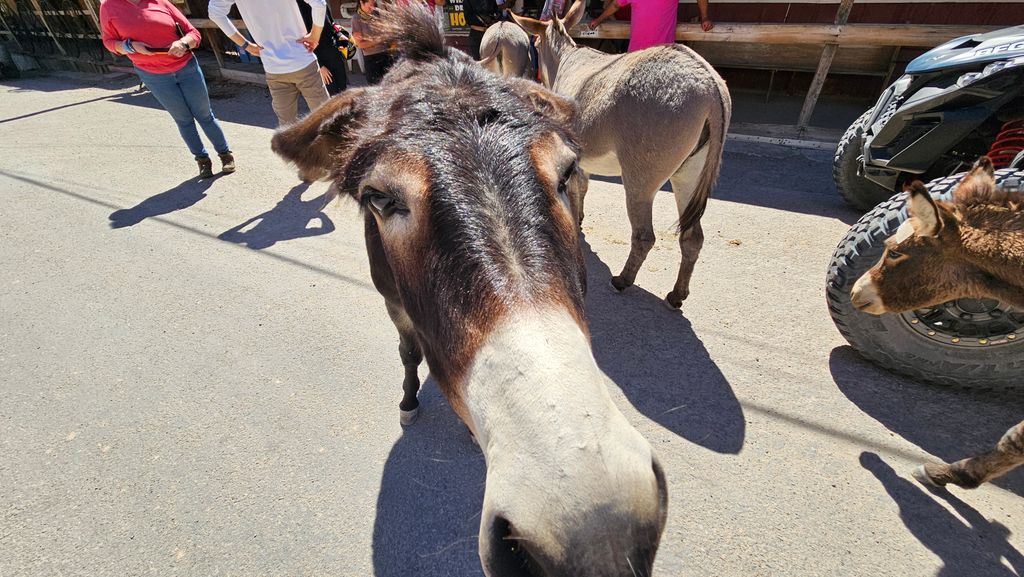 On the trails, it seems like they might be a little more circumspect (although not always, we were told). But if you actually enter the town of Oatman, they're everywhere. In the street, on the sidewalks, poking their heads into and out of shops, into and out of your vehicle; you name it.