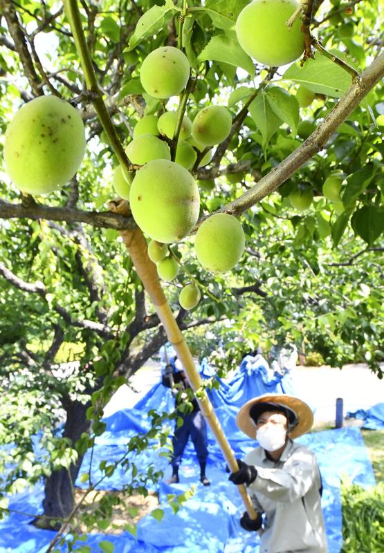 A worker rustles a Japanese plum tree with a bamboo pole to knock plums to the ground at Kairakuen park in Mito on Thursday. The park -- said to be one of the top three Japanese gardens -- has about 3,000 plum trees and is a well-known viewing site for plum blossoms. By knocking the plums to the ground, the tree retains its nutrients and can bear more blossoms next year, according to the park center. Plums that have fallen to the ground will be sold to visitors from Saturday morning.