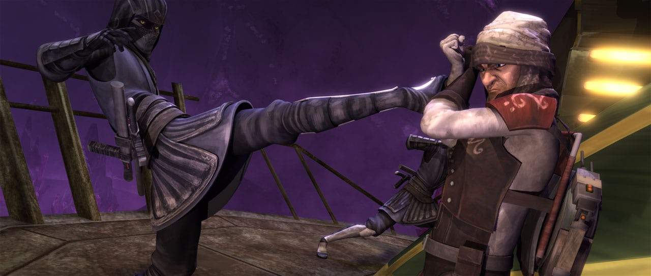What's interesting about Dengar's new appearance is how it seems to be an amalgamation of all the bio-enhancements we've seen on Star Wars villains before — mechanical arms, stormtrooper armor, and an "anguished rictus" that looks like a rough draft of Palpatine's melted face.