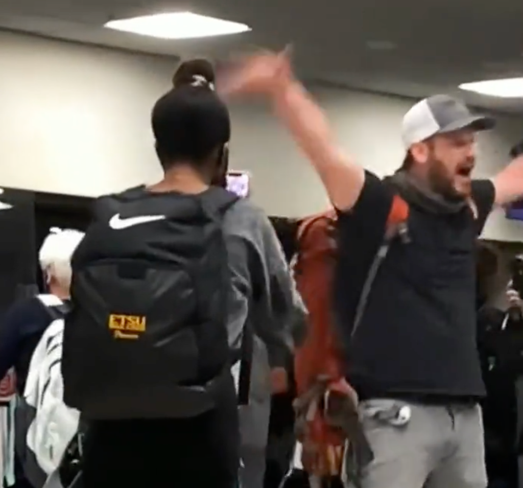 The unmasked man, wearing a backpack and baseball cap, attempted to start the uprising at Hartsfield-Jackson International Airport in Atlanta, Georgia, where he berated customers waiting on line.