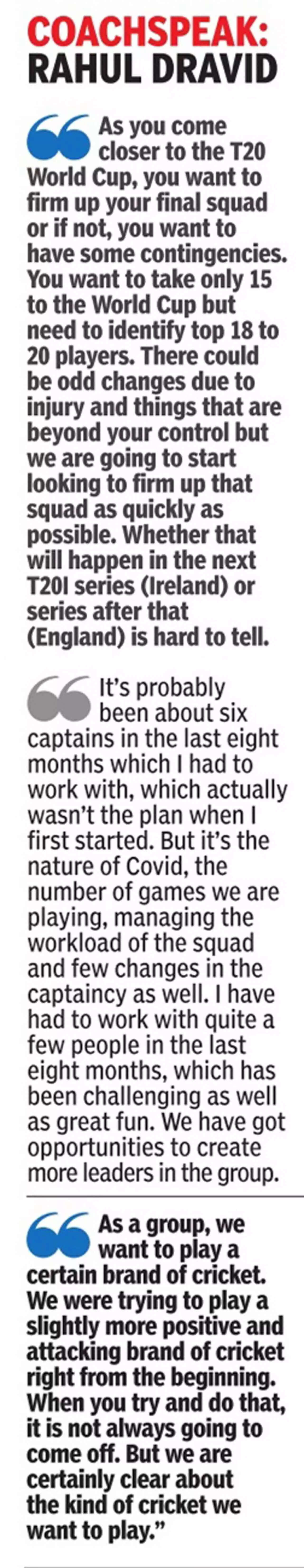 With workload management and injuries, the Indian team has seen some shuffling in the T20 squads. But Dravid underlined the fact that the team management was in the process of firming up the squad for the T20 World Cup.