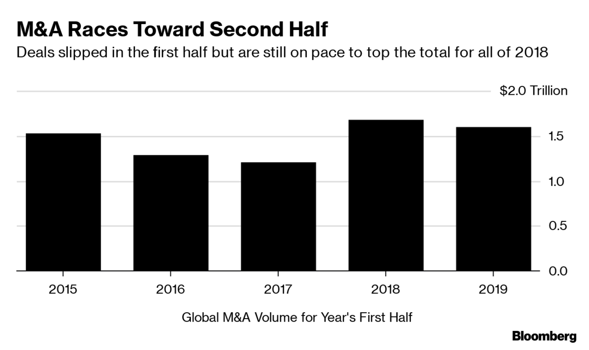 With 13,243 deals announced with a total value of $1.6 trillion, the first half of 2019 through this week is slightly behind last year, as Europe and Asia lag the U.S., according to data compiled by Bloomberg. The number of deals is down 9%, compared with 14,518 transactions totaling $1.7 trillion during the first half of 2018, the data showed.