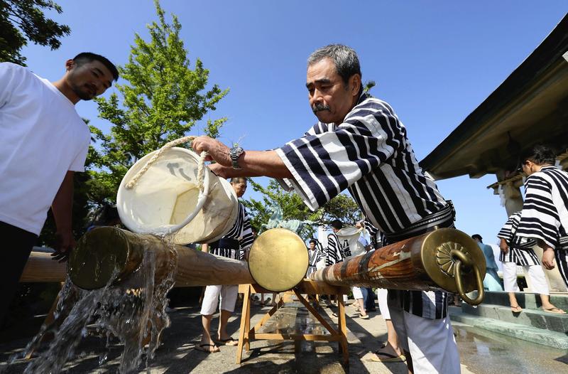 Men clad in traditional happi coats ritually purify kakibo poles in preparation for the Hakata Gion Yamakasa festival, on Friday at Kushida Shrine Hamamiya in Hakata Ward, Fukuoka. The poles, some as long as 7.2 meters, carry the festival's yamakasa floats. Full-scale preparations kicked off on the same day, when the men were allowed to wear the official attire for the festival, the city's summer highlight that runs from July 1 to 15.