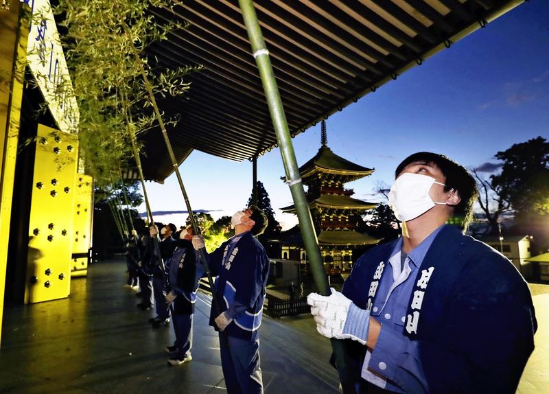 Workers dust under the eaves of the Great Main Hall of Naritasan Shinshoji temple in Narita, Chiba Prefecture, on Thursday. Called susu-harai, the yearend dusting took place once a senior temple priest began the goma fire ritual just before 5 a.m. About 40 workers and priests dusted using bamboo about 10 meters tall. About 3 million visitors are expected at the temple over the first three days of the New Year.
