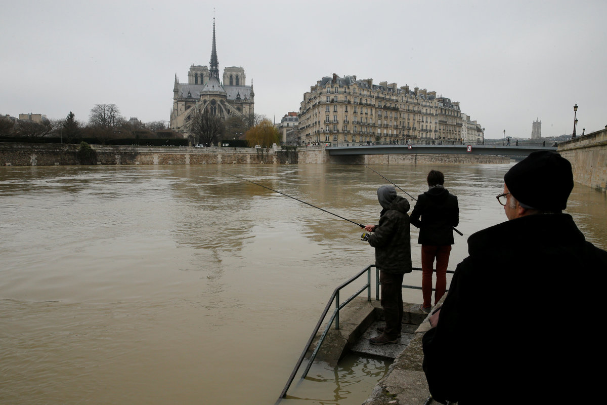 Two men fish on the flooded banks of the River Seine in Paris, France, after days of almost non-stop rain caused flooding in the country, January 27, 2018. REUTERS/Pascal Rossignol