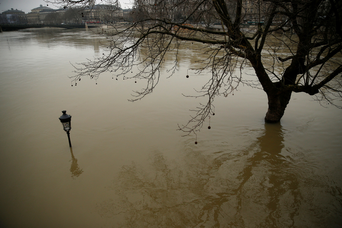 A street lamp and a tree are seen on the flooded banks of the River Seine in Paris, France, after days of almost non-stop rain caused flooding in the country, January 27, 2018. REUTERS/Pascal Rossignol