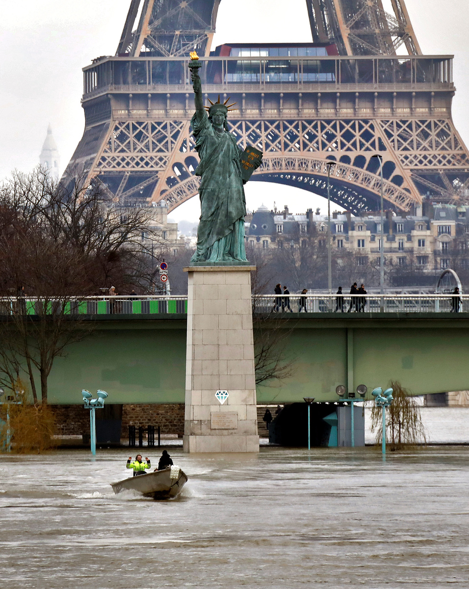 A boat on the flooded River Seine passes the Statue of Liberty replica after days of almost non-stop rain caused flooding in the country, in Paris, France January 27, 2018. REUTERS/Mal Langsdon