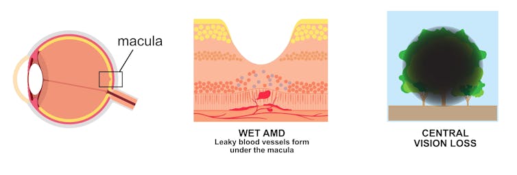 Wet AMD occurs when there is a build-up of fluid and new, leaky blood vessels underneath the macula, causing rapid and severe impact to a person’s central vision.
