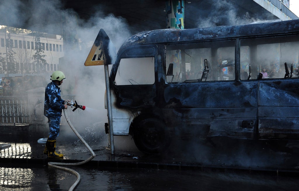 Syrian state TV showed footage of the charred bus in central Damascus, saying the blasts occurred while people were heading to work and school. The report said a third bomb was discovered and dismantled in the same area.
