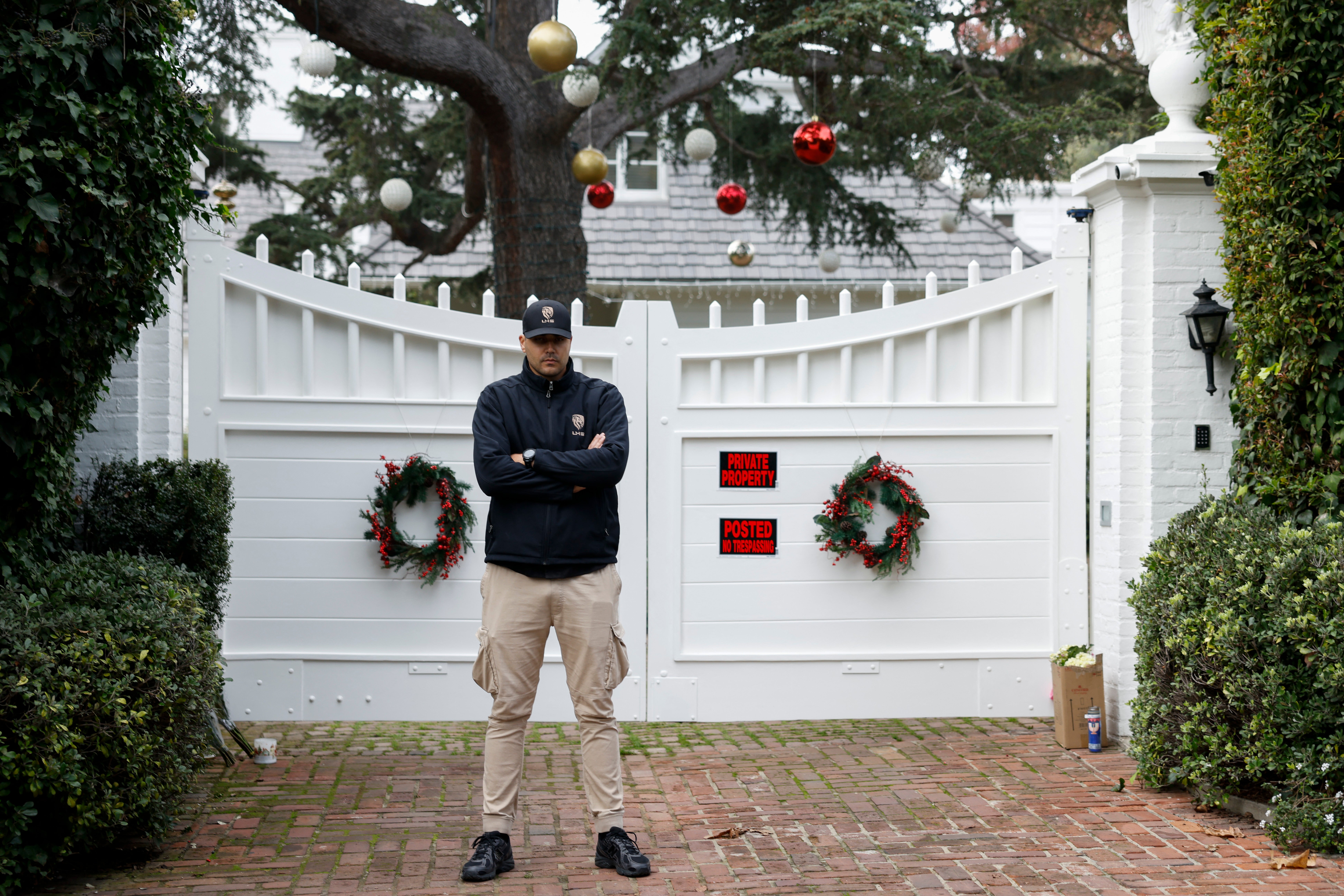 Pictures show a security guard standing watch near the couple’s front gate, which is decorated with holiday wreaths.