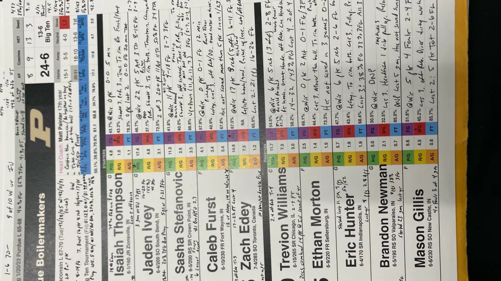 Hummel puts in the work for his analysis. He makes boards that list the players and include individual and team stats. He adds his own scouting reports from all the video he watches. Using Synergy Sports Technology, Hummel can watch clips of players in all kinds of situations – and in all kinds of places.