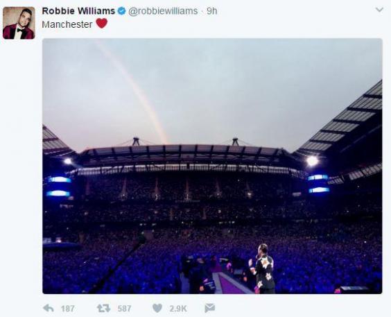 Jess Spreadbury said on Twitter: "robbiewilliams literally couldn't sing Angels as he stood there with tears in his eyes, he let his fans sing it for him! United as 1!!"