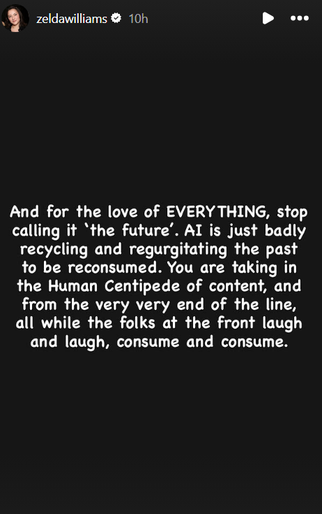 “AI is just badly recycling and regurgitating the past to be reconsumed. You are taking in the Human Centipede of content, and from the very very end of the line, all while the folks at the front laugh and laugh, consume and consume.”