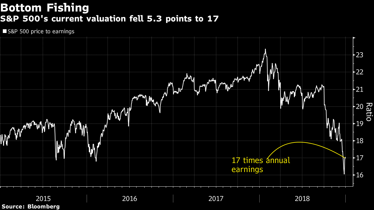 The S&P 500’s price-to-earnings ratio fell 5.3 points last year to 17, data compiled by Bloomberg show. Larger full-year declines in P/Es have occurred only two times since the data started being collected in 1954, and there were bear markets during both: 1973 and 2002.