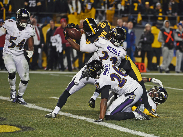 The Steelers shaved the Ravens' lead to 20-17 with 11:41 left in the game when Bell cut nicely outside and ran 7 yards for a touchdown. That ended a five-play, 75-yard drive that featured a 35-yard pass interference penalty against Baltimore rookie cornerback Tavon Young.