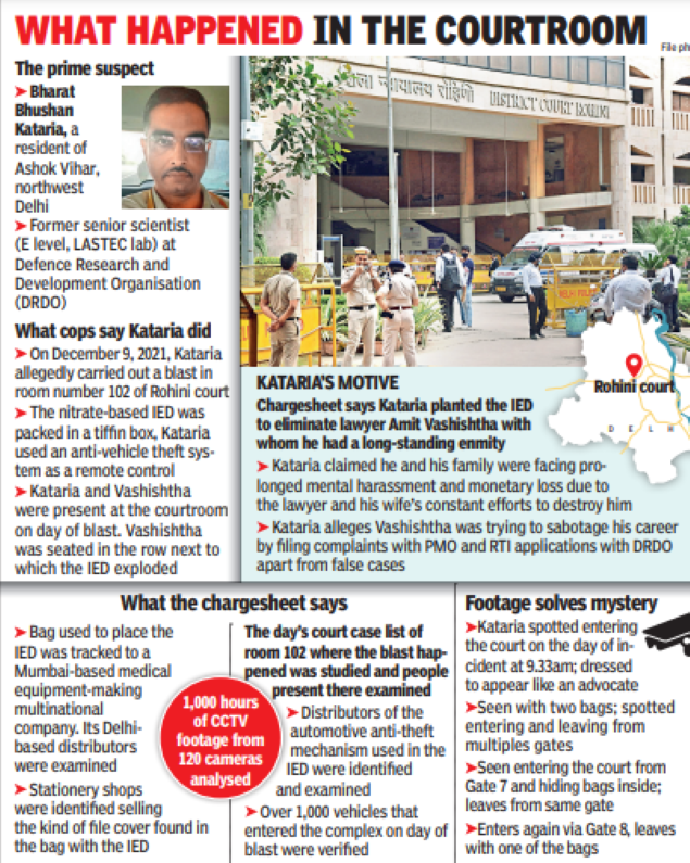 NEW DELHI: Remnants seized from the house of senior DRDO scientist Bharat Bhushan Kataria, which were matched forensically with substances recovered from Rohini District Courts Complex, helped police build a watertight case against the accused for carrying out an IED blast inside a courtroom in December 2021.