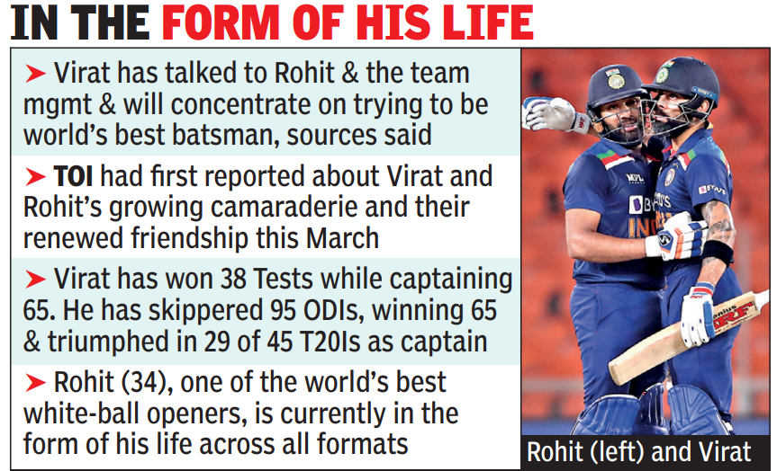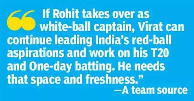 Kohli (32), who currently leads the team across all formats and is India’s most successful captain ever, is learned to have taken the call to share leadership responsibilities with Sharma (34), BCCI sources told TOI.