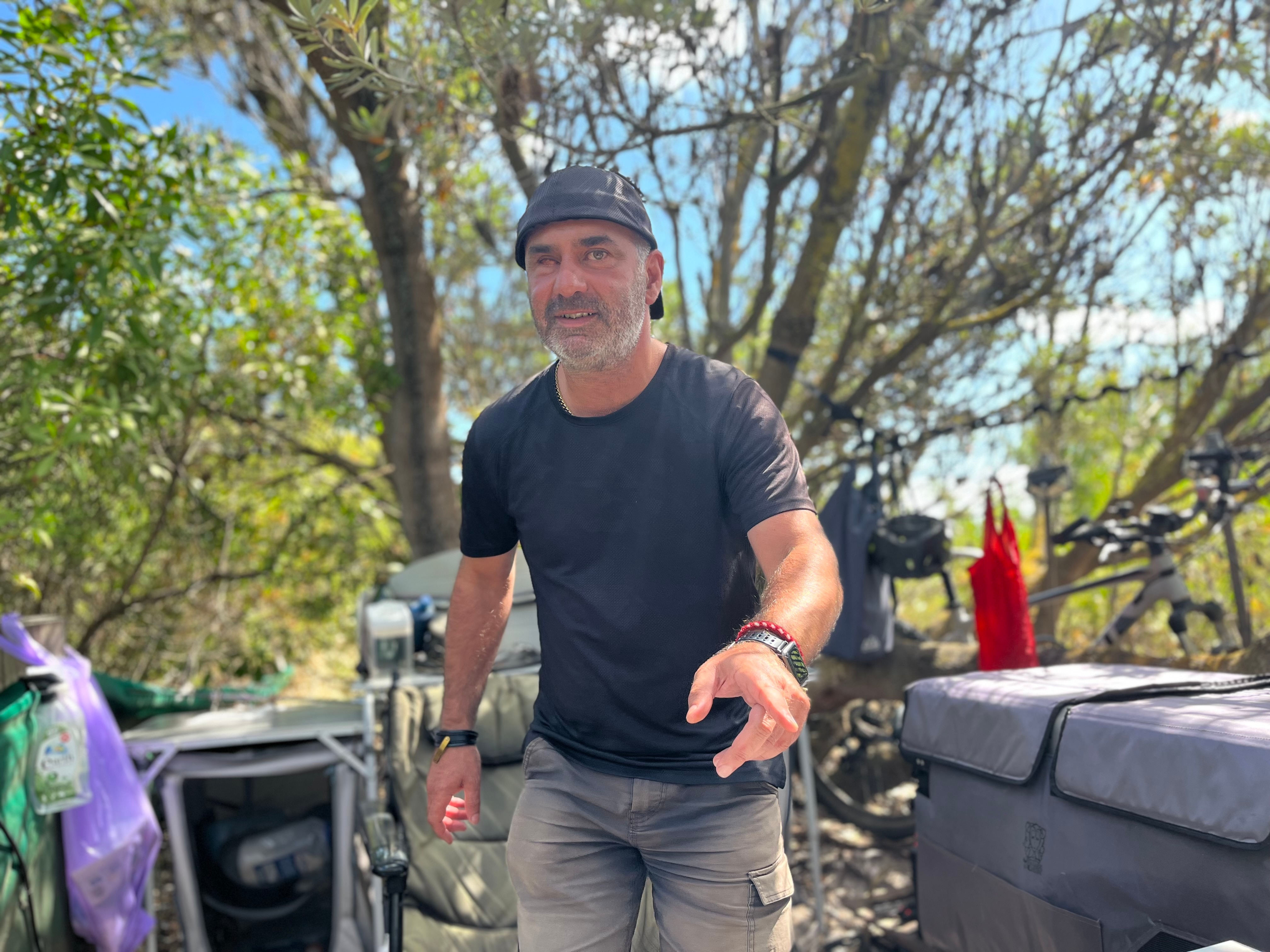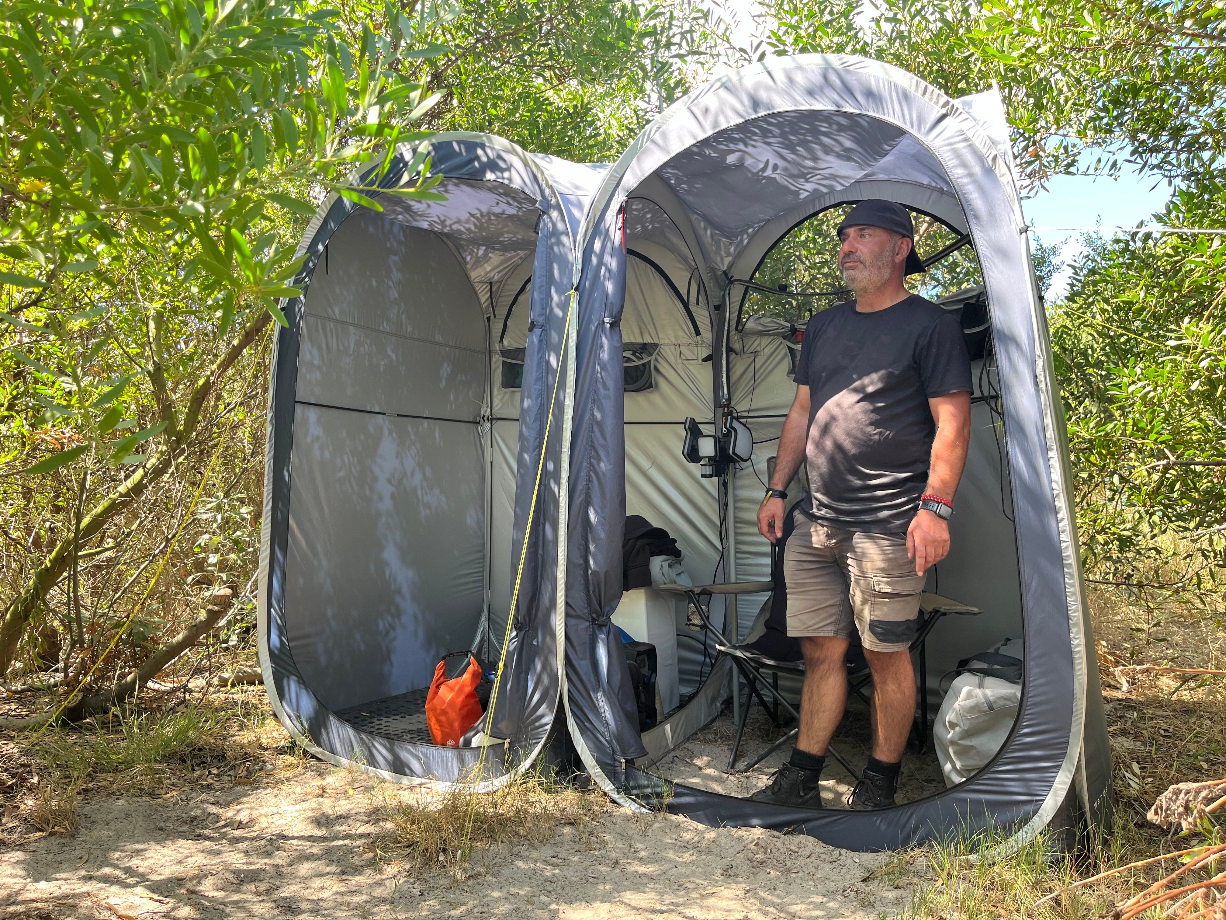 As well as his camp kitchen, there is a sleeping area with a tent, and a bathroom constructed from portable showers.