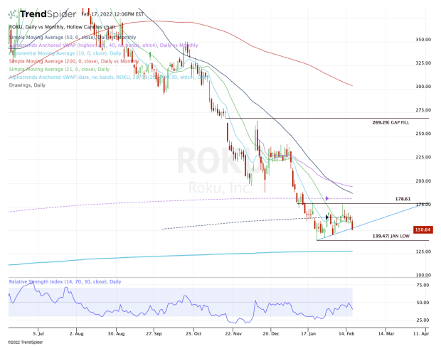 On the upside, bulls will want to see Roku stock clear the 10-day, 21-day and 50-month moving averages. Over $165 will put the $178 area in play, then the monthly VWAP and declining 50-day moving average.