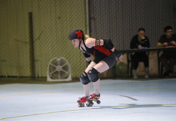 SANTA CRUZ, Calif. _ With one minute left on the clock, skater Krista Corwin places her front wheels just behind the starting line _ core tight, legs coiled, arms ready to pump furiously. The roar of the crowd and the flash of the cameras fade away as Corwin waits for the final whistle in the bout between the Santa Cruz Derby Girls' Boardwalk Bombshells and Bay Area Derby's Berkeley Resistance.