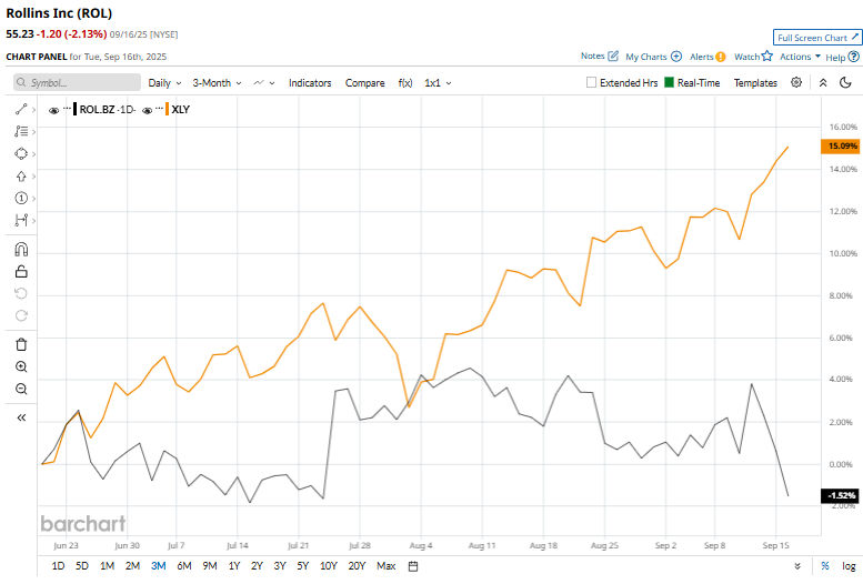 ROL recently touched its 52-week high of 59.10 on Aug. 8 and is currently trading 6.6% below the peak. Shares of Rollins have fallen 2.6% over the past three months, lagging the Consumer Discretionary Select Sector SPDR Fund (XLY), which has gained 13.2% over the same time frame.