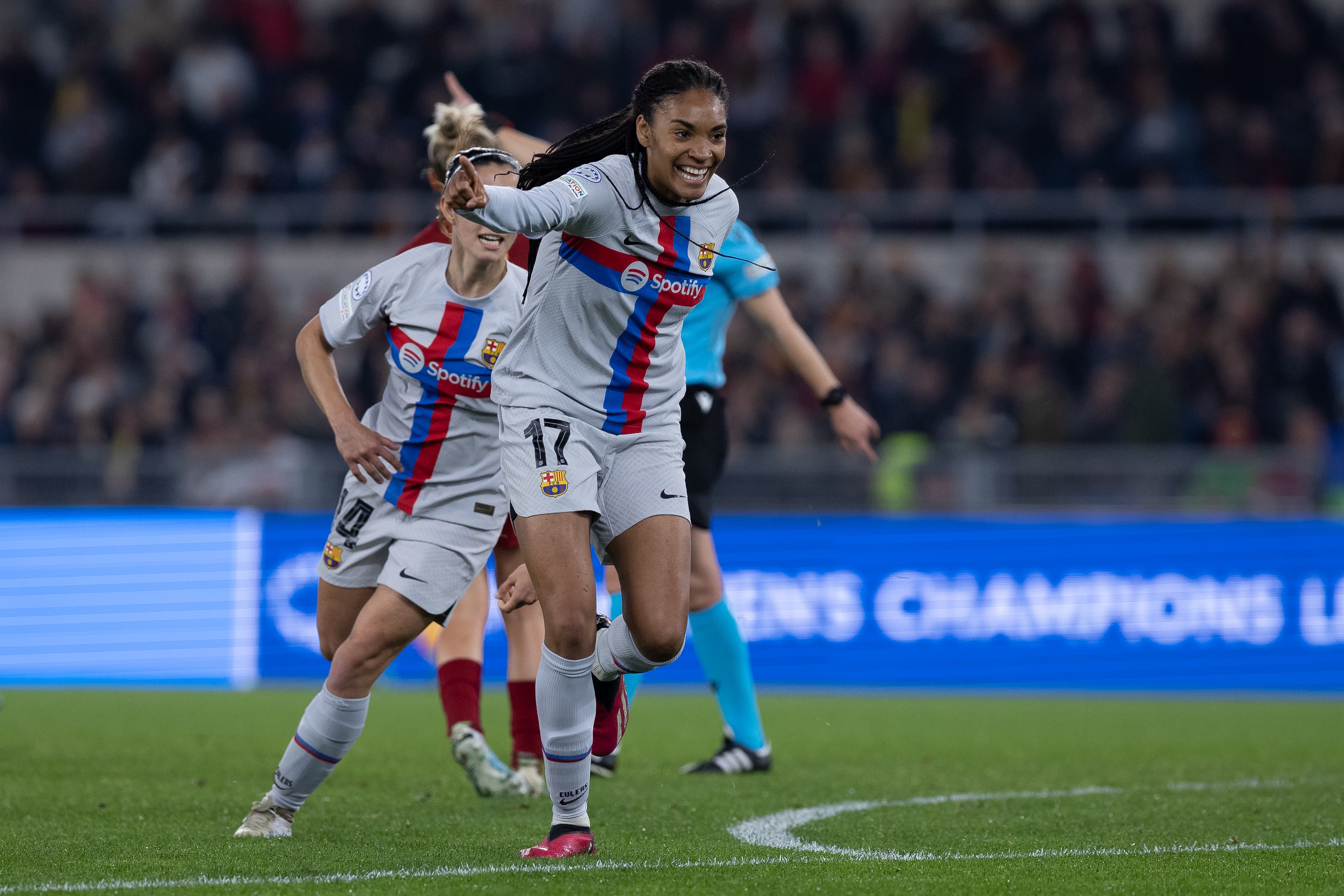 Just after the half-hour, the 2022 UWCL finalists finally broke through Roma's red wall with the pacey former sprinter Paralluelo scoring her first Champions League goal with a rocket from outside the box.