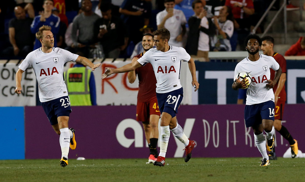 Soccer Football - AS Roma vs Tottenham Hotspur - International Champions Cup - Red Bull Arena, New Jersey - July 25, 2017 Tottenham's Harry Winks celebrates scoring their first goal with Christian Eriksen and Georges-Kevin Nkoudou REUTERS/Mike Segar