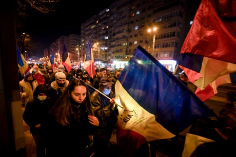 The protest was organized by the Alliance for the Unity of Romanians, a right-wing political party established a little over a year ago by leaders who opposed same-sex marriages and have supported Orthodox clerics who defied pandemic restrictions to hold religious ceremonies.