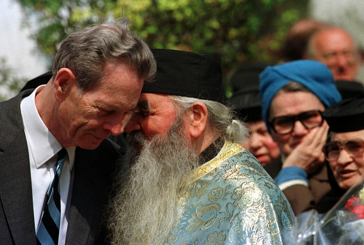 FILE PHOTO - Romania's exiled King Michael talks with an Orthodox priest during his visit at Timiseni monastery, near the Romanian city of Timisoara, 600 km, (375 miles) west of Bucharest, April 26, 1997. REUTERS/Radu Sigheti/File Photo