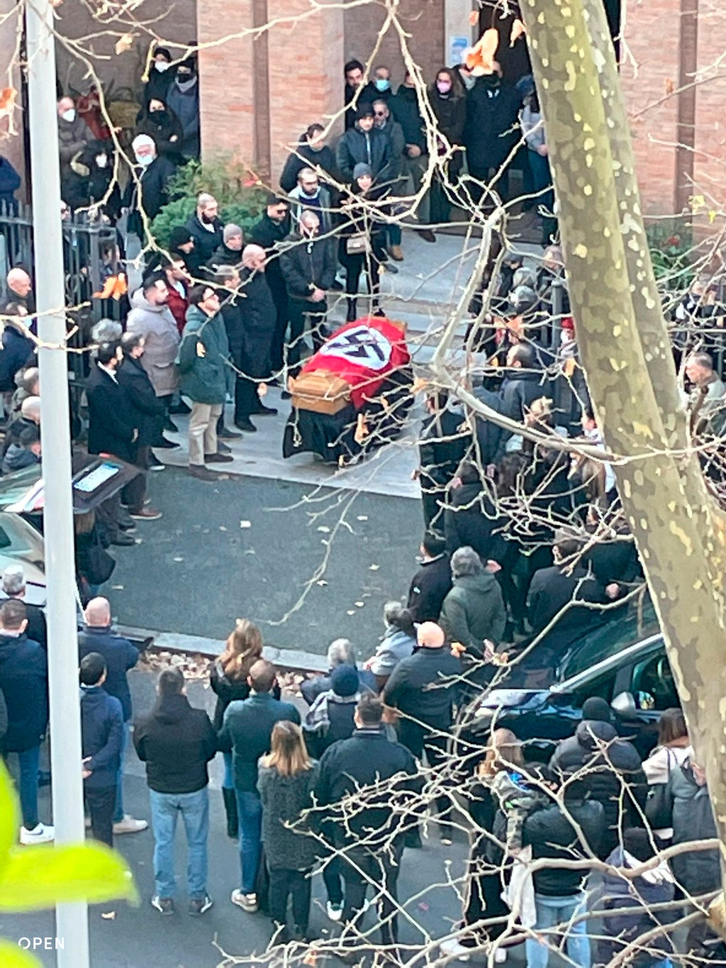 Photos and video of the scene outside St. Lucia church following the Monday funeral service were published by the Italian online news portal Open. They showed around two dozen people gathered outside the church as the swastika-draped casket emerged, shouting “Presente!” with their right arm extended in the fascist salute.