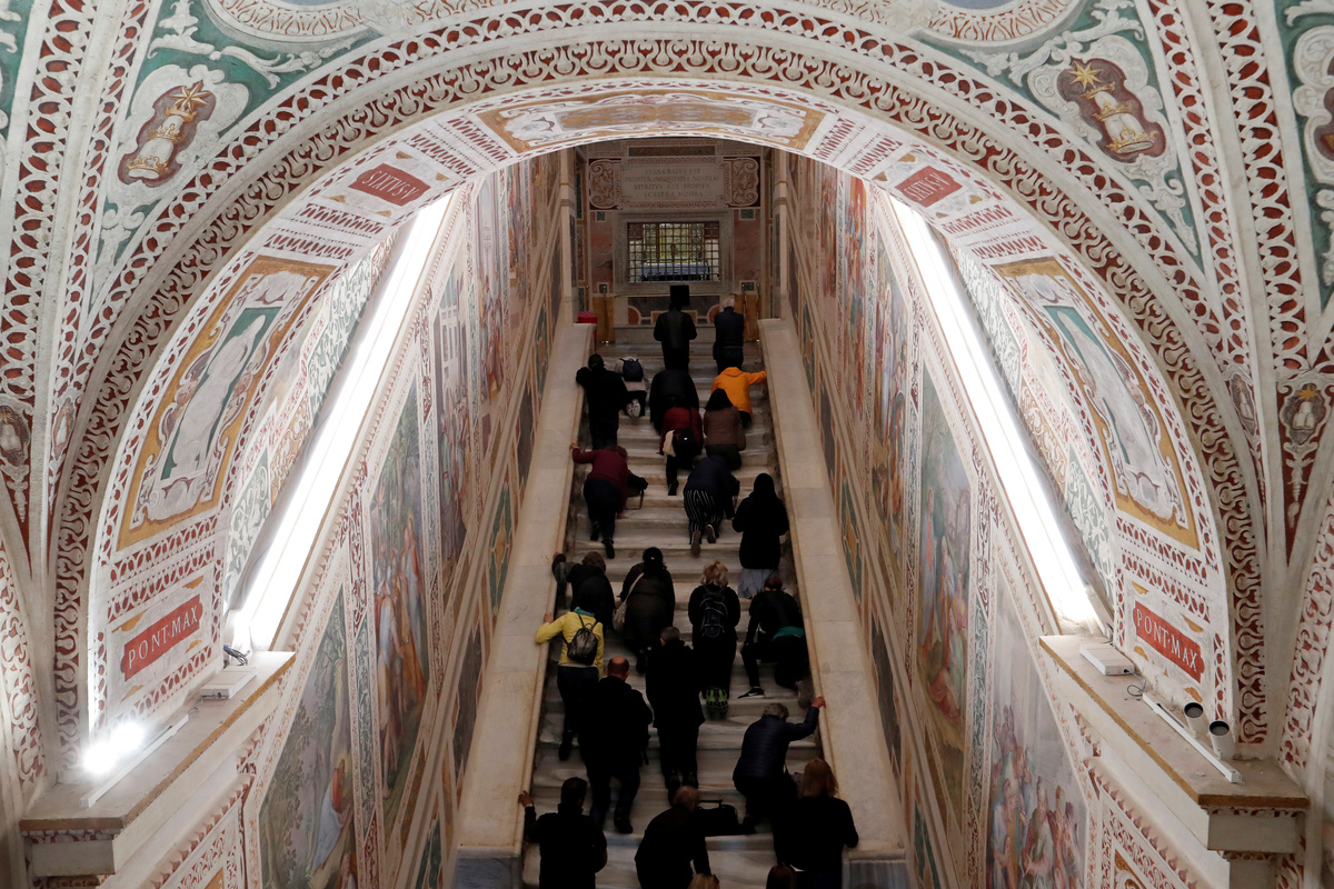 According to tradition, the stairs, known as the "Scala Sancta," were part of Pontius Pilate's palace in Jerusalem and brought to Rome in 326 by St. Helen, the mother of Roman emperor Constantine, after she converted to Christianity.