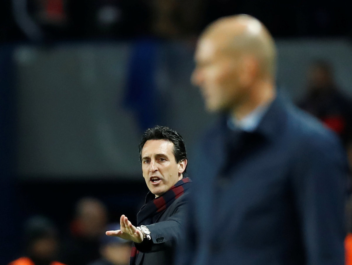 Soccer Football - Champions League Round of 16 Second Leg - Paris St Germain vs Real Madrid - Parc des Princes, Paris, France - March 6, 2018 Paris Saint-Germain coach Unai Emery and Real Madrid coach Zinedine Zidane REUTERS/Gonzalo Fuentes