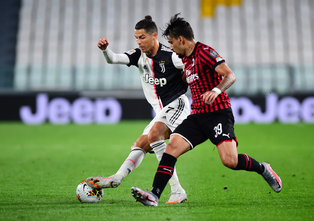 Soccer Football - Coppa Italia Semi Final Second Leg - Juventus v AC Milan - Allianz Stadium, Turin, Italy - June 12, 2020 Juventus' Cristiano Ronaldo in action with AC Milan's Lucas Paqueta, as play resumes behind closed doors following the outbreak of the coronavirus disease (COVID-19) REUTERS/Massimo Pinca