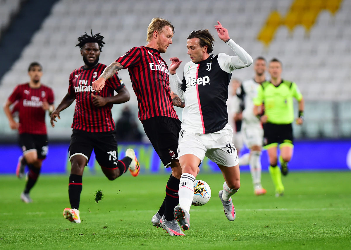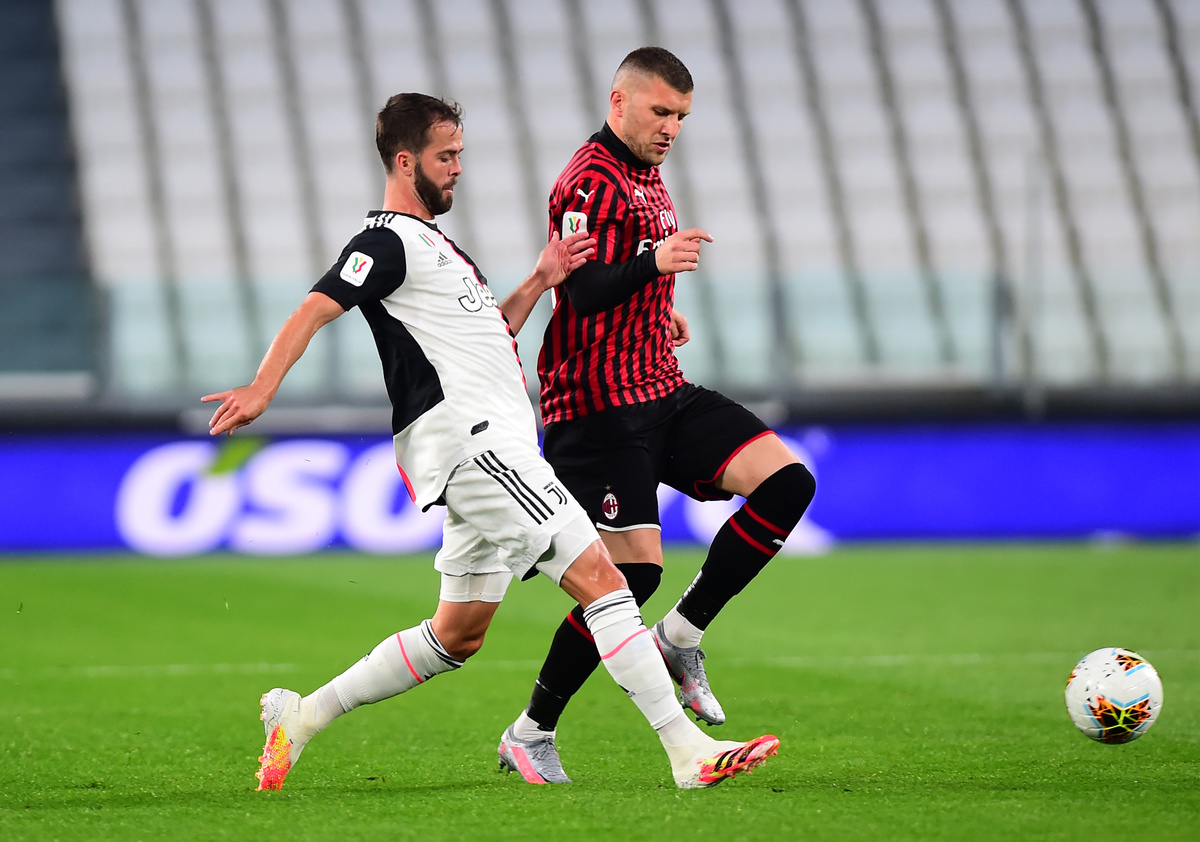 Soccer Football - Coppa Italia Semi Final Second Leg - Juventus v AC Milan - Allianz Stadium, Turin, Italy - June 12, 2020 AC Milan's Ante Rebic in action with Juventus' Miralem Pjanic, as play resumes behind closed doors following the outbreak of the coronavirus disease (COVID-19) REUTERS/Massimo Pinca