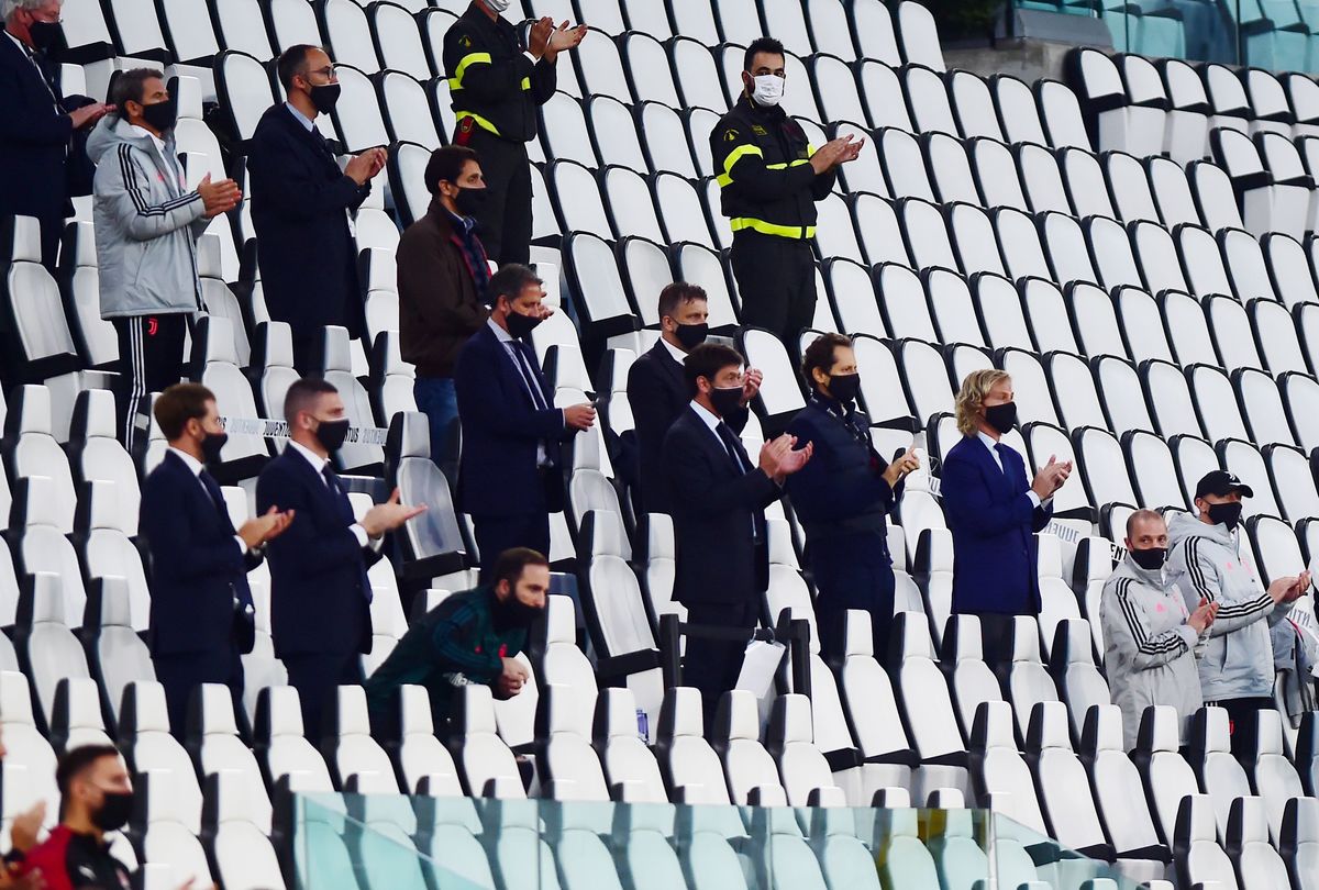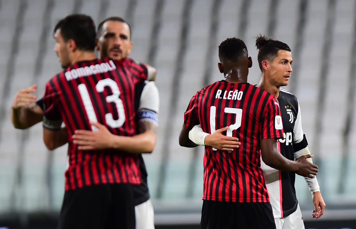 Soccer Football - Coppa Italia Semi Final Second Leg - Juventus v AC Milan - Allianz Stadium, Turin, Italy - June 12, 2020 Juventus' Cristiano Ronaldo reacts, as play resumes behind closed doors following the outbreak of the coronavirus disease (COVID-19) REUTERS/Massimo PincaSoccer Football - Coppa Italia Semi Final Second Leg - Juventus v AC Milan - Allianz Stadium, Turin, Italy - June 12, 2020 Juventus' Paulo Dybala in action with AC Milan's Franck Kessie and Alessio Romagnoli, as play resumes behind closed doors following the outbreak of the coronavirus disease (COVID-19) REUTERS/Massimo PincaSoccer Football - Coppa Italia Semi Final Second Leg - Juventus v AC Milan - Allianz Stadium, Turin, Italy - June 12, 2020 AC Milan's Franck Kessie in action with Juventus' Rodrigo Bentancur, as play resumes behind closed doors following the outbreak of the coronavirus disease (COVID-19) REUTERS/Massimo PincaSoccer Football - Coppa Italia Semi Final Second Leg - Juventus v AC Milan - Allianz Stadium, Turin, Italy - June 12, 2020 AC Milan's Simon Kjaer in action with Juventus' Federico Bernardeschi, as play resumes behind closed doors following the outbreak of the coronavirus disease (COVID-19) REUTERS/Massimo PincaSoccer Football - Coppa Italia Semi Final Second Leg - Juventus v AC Milan - Allianz Stadium, Turin, Italy - June 12, 2020 AC Milan coach Stefano Pioli after the match, as play resumes behind closed doors following the outbreak of the coronavirus disease (COVID-19) REUTERS/Massimo PincaSoccer Football - Coppa Italia Semi Final Second Leg - Juventus v AC Milan - Allianz Stadium, Turin, Italy - June 12, 2020 Juventus' Cristiano Ronaldo and AC Milan's Rafael Leao after the match, as play resumes behind closed doors following the outbreak of the coronavirus disease (COVID-19) REUTERS/Massimo PincaSoccer Football - Coppa Italia Semi Final Second Leg - Juventus v AC Milan - Allianz Stadium, Turin, Italy - June 12, 2020 Juventus coach Maurizio Sarri reacts, as play resumes behind closed doors following the outbreak of the coronavirus disease (COVID-19) REUTERS/Massimo PincaSoccer Football - Coppa Italia Semi Final Second Leg - Juventus v AC Milan - Allianz Stadium, Turin, Italy - June 12, 2020 Juventus President Andrea Agnelli and Vice Chairman Pavel Nedved applaud after a minutes silence for the victims of the coronavirus disease, as play resumes behind closed doors following the outbreak of the coronavirus disease (COVID-19) REUTERS/Massimo PincaSoccer Football - Coppa Italia Semi Final Second Leg - Juventus v AC Milan - Turin, Italy - June 12, 2020 A fan watches the match in a bar in Milan, as play resumes behind closed doors following the outbreak of the coronavirus disease (COVID-19) REUTERS/Flavio Lo Scalzo
