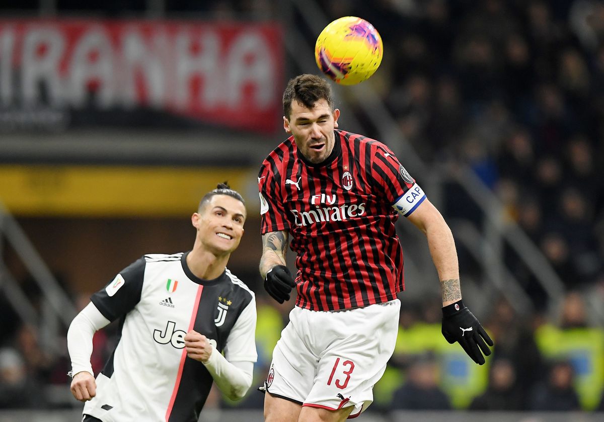 Soccer Football - Coppa Italia Semi Final First Leg - AC Milan v Juventus - San Siro, Milan, Italy - February 13, 2020 AC Milan's Alessio Romagnoli in action with Juventus' Cristiano Ronaldo REUTERS/Alberto Lingria