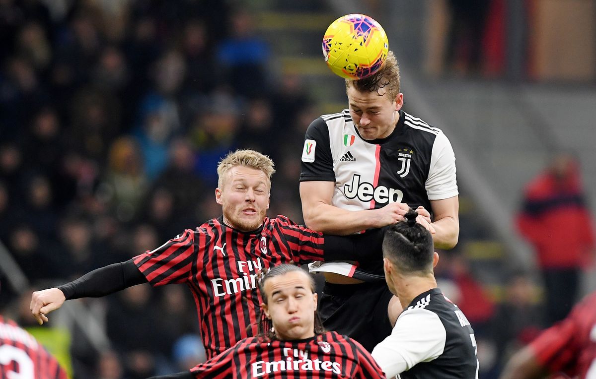 Soccer Football - Coppa Italia Semi Final First Leg - AC Milan v Juventus - San Siro, Milan, Italy - February 13, 2020 Juventus' Matthijs de Ligt heads at goal REUTERS/Alberto Lingria