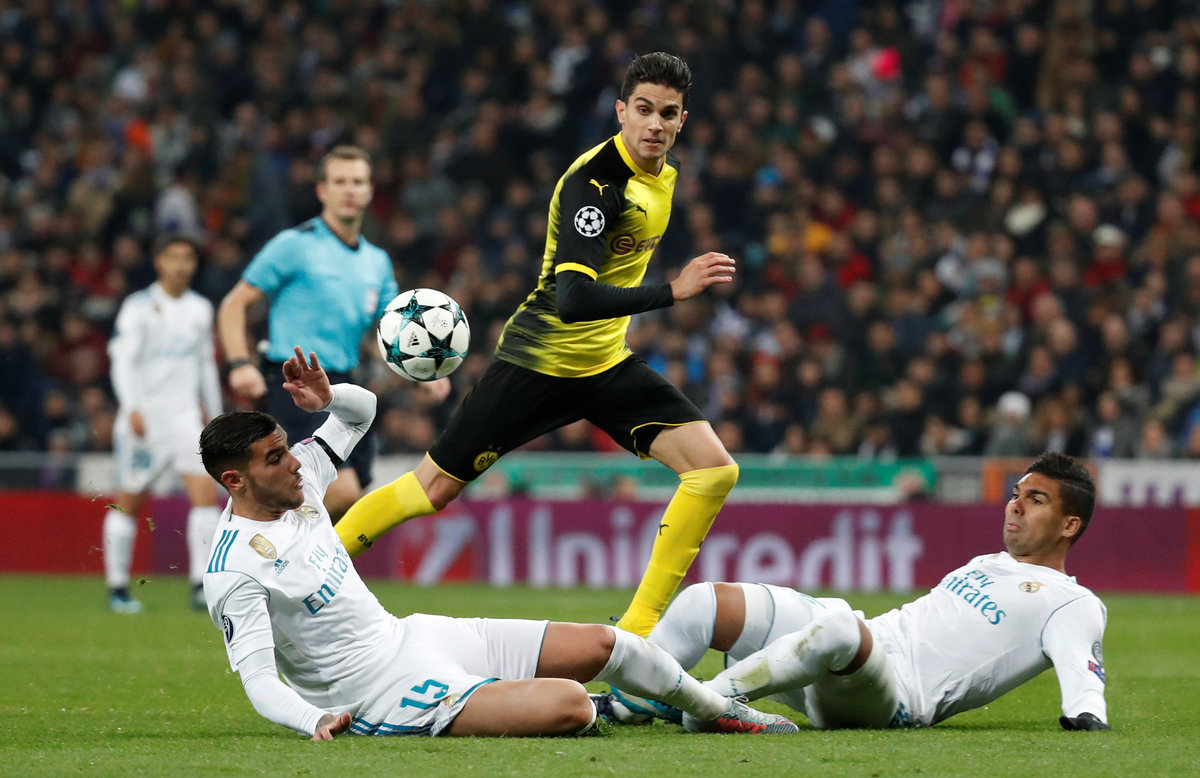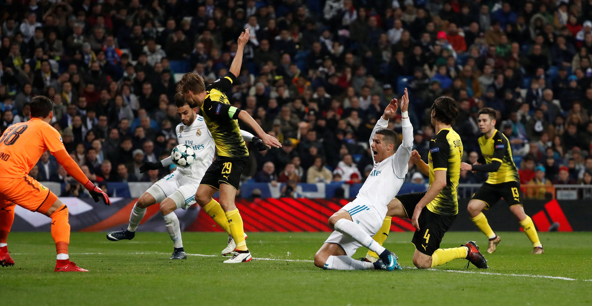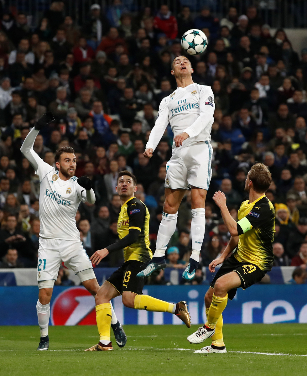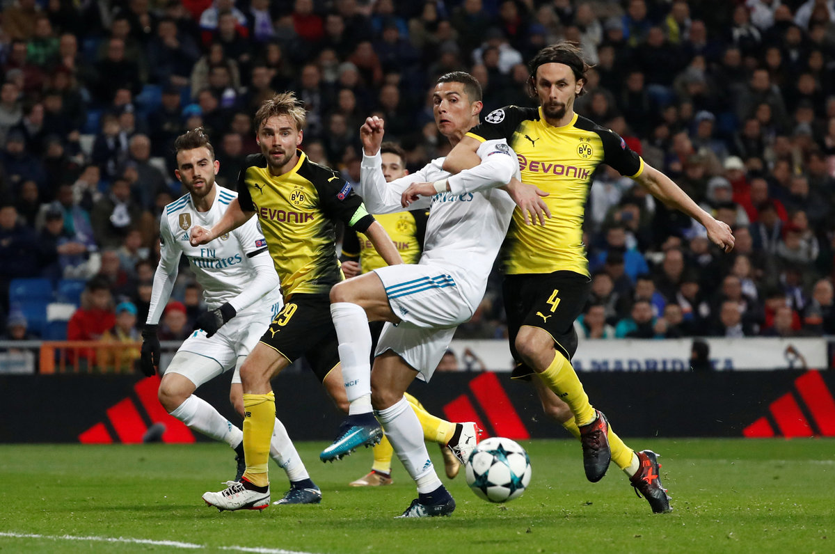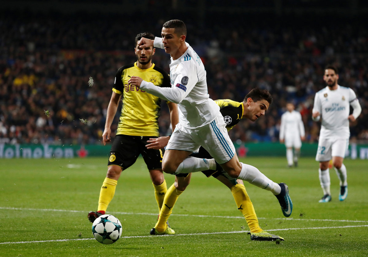 Soccer Football - Champions League - Real Madrid vs Borussia Dortmund - Santiago Bernabeu, Madrid, Spain - December 6, 2017 Real Madrid’s Cristiano Ronaldo in action REUTERS/Paul HannaSoccer Football - Champions League - Real Madrid vs Borussia Dortmund - Santiago Bernabeu, Madrid, Spain - December 6, 2017 Real Madrid’s Cristiano Ronaldo in action with Borussia Dortmund’s Neven Subotic REUTERS/Juan MedinaSoccer Football - Champions League - Real Madrid vs Borussia Dortmund - Santiago Bernabeu, Madrid, Spain - December 6, 2017 Borussia Dortmund’s Julian Weigl in action with Real Madrid’s Theo Hernandez and Casemiro REUTERS/Paul HannaSoccer Football - Champions League - Real Madrid vs Borussia Dortmund - Santiago Bernabeu, Madrid, Spain - December 6, 2017 Real Madrid’s Cristiano Ronaldo in action with Borussia Dortmund’s Marc Bartra REUTERS/Juan MedinaSoccer Football - Champions League - Real Madrid vs Borussia Dortmund - Santiago Bernabeu, Madrid, Spain - December 6, 2017 Real Madrid’s Cristiano Ronaldo in action with Borussia Dortmund’s Neven Subotic REUTERS/Juan MedinaSoccer Football - Champions League - Real Madrid vs Borussia Dortmund - Santiago Bernabeu, Madrid, Spain - December 6, 2017 Borussia Dortmund’s Mahmoud Dahoud in action with Real Madrid’s Nacho REUTERS/Juan Medina
