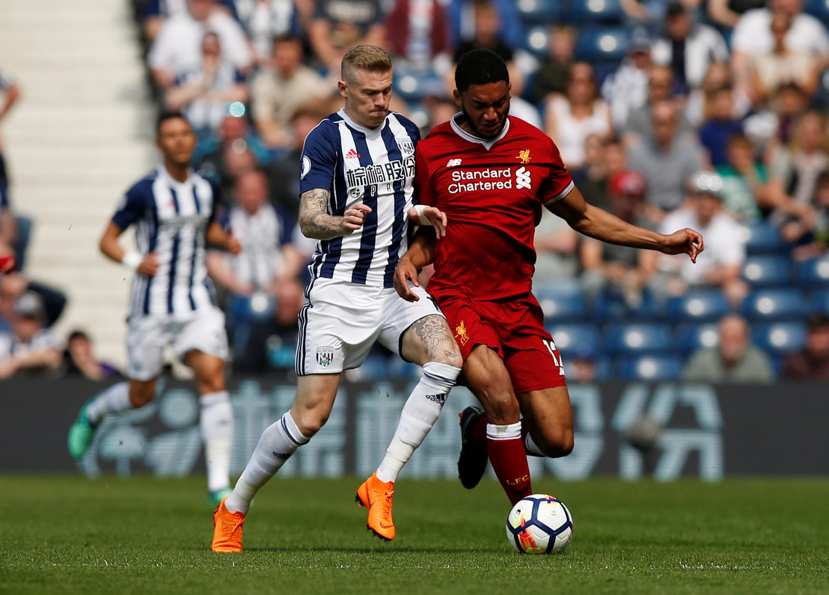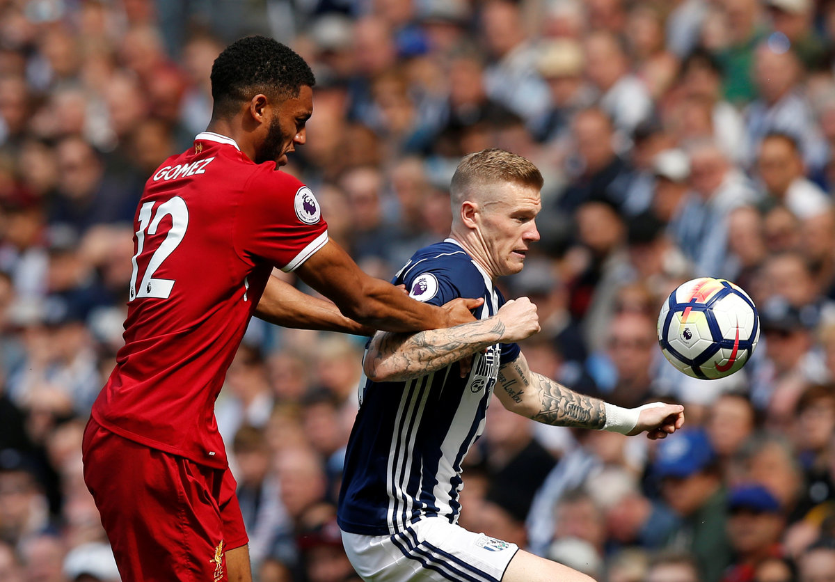 Soccer Football - Premier League - West Bromwich Albion v Liverpool - The Hawthorns, West Bromwich, Britain - April 21, 2018 Liverpool's Joe Gomez in action with West Bromwich Albion's James McClean REUTERS/Andrew Yates