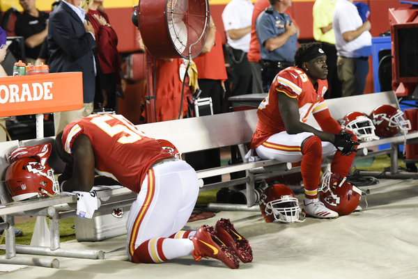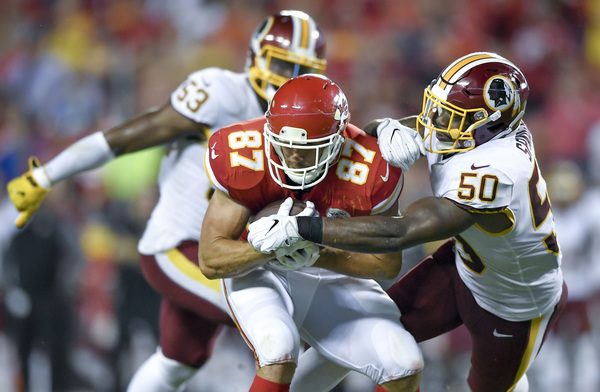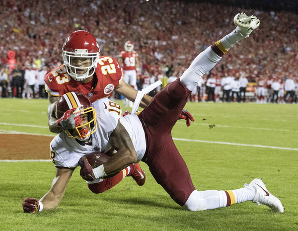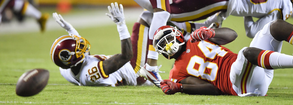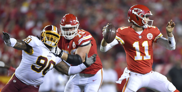 The Chiefs did not respond well. Their first offensive play ended with a sack by Washington's Ryan Kerrigan (who was essentially unblocked). Their second next play ended with starting right guard Laurent Duvernay-Tardif injuring his knee and leaving the game. The third play ended with a clean drop by Tyreek Hill.