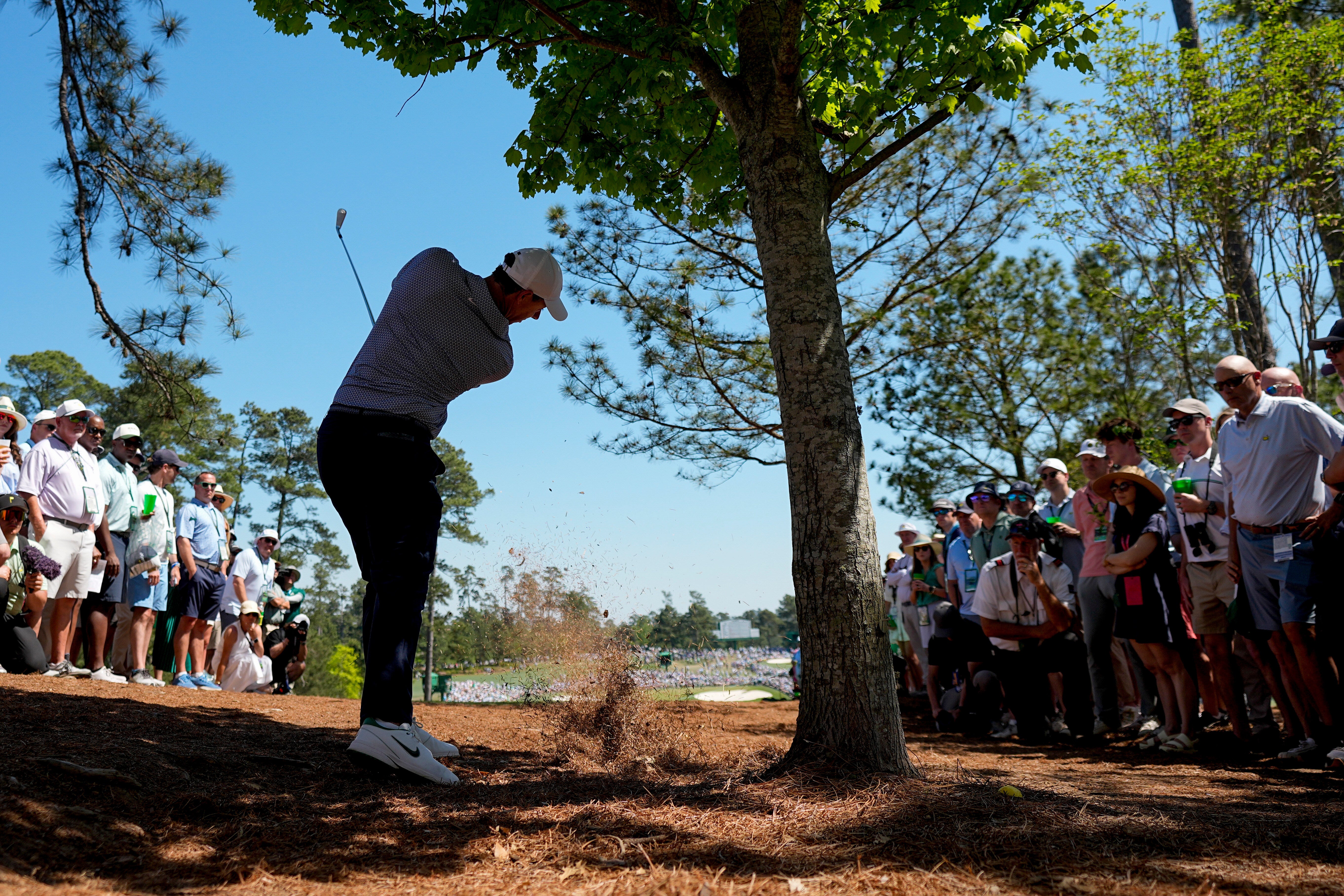 The troubles off the tee which he has been successfully managing all week cost him dearly and he immediately retired to the range to find a fix ahead of his final-group pairing with Cameron Young, who shot a Masters-best 65, on 11 under.