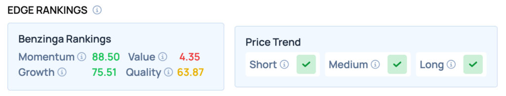 Tesla scores well on Momentum and Growth metrics, while offering satisfactory Quality, but poor Value. Tesla also offers a favorable price trend in the Short, Medium and Long term. For more such insights, sign up for Benzinga Edge Stock Rankings today!